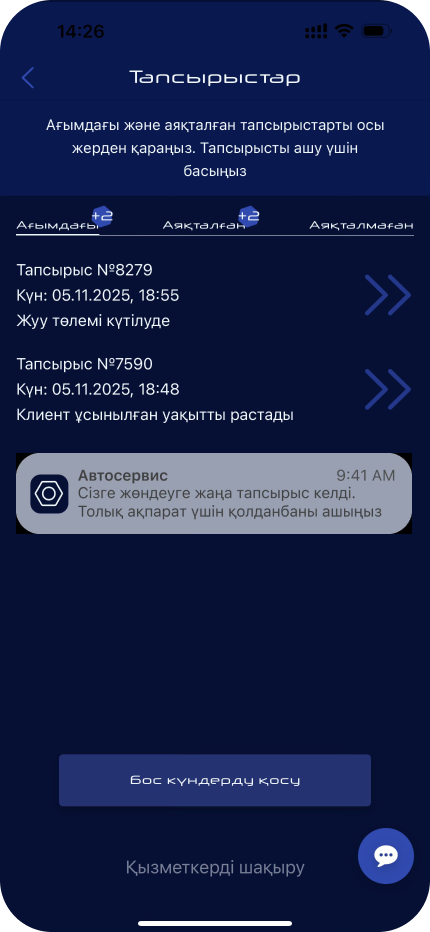 Тапсырыстарды қабылдаңыз, дефект актілерін жасаңыз, төлем алыңыз және клиенттерге онлайн хабарлаңыз.