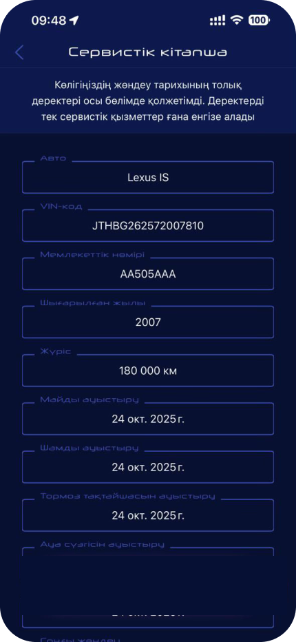 Көлігіңізді сатсаңыз да, тек май маркасын ұмытсаңыз да — Қолданбаны ашып, Сервистік кітапшаны көрсетсеңіз жеткілікті.